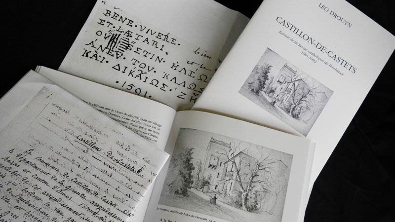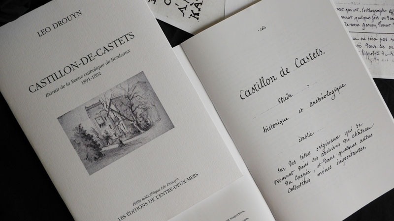 Cette nouvelle publication dans la collection Petite bibliothèque Leo Drouyn s’inscrit dans la continuité de l’étude présentée précédemment dans la même collection, Doulezon, Etude historique et archéologique, puisqu’il s’agit, cette fois encore, d’une monographie communale de Leo Drouyn parue dans la Revue catholique de Bordeaux. Donnée aux lecteurs en six livraisons, entre fin 1891 et début 1892, ce texte est la concrétisation d’une étude manuscrite de 48 pages datée du 20 novembre 1869 : Castillon de Castets, Etude historique et archèologique, établie sur des titres originaux qui se trouvent dans les archives de château du Carpia et dans quelques autres collections moins importantes.