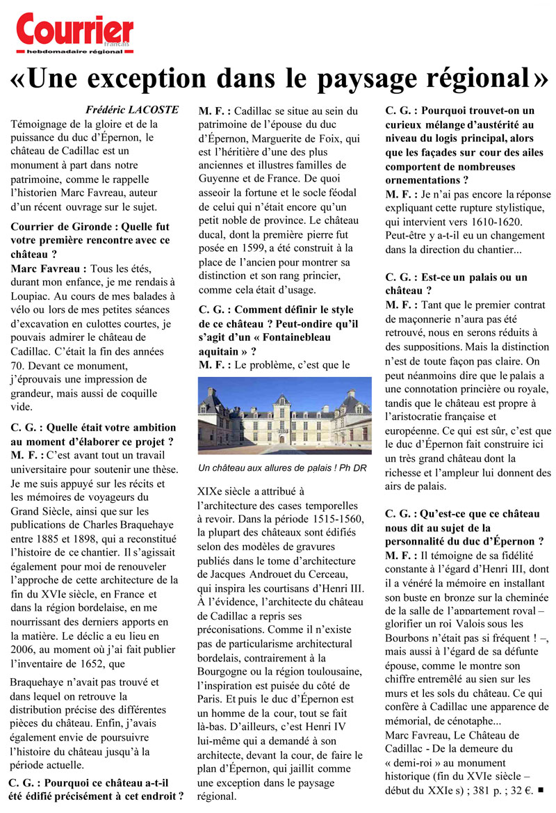 s informations à son sujet. Cet intérêt n’a fait que croître après la fermeture en 1952 de la prison qui avait été établie dans le château. Parmi les principaux travaux qui lui ont depuis été consacrés, il faut ainsi citer le livre que Jacques d’Welles lui a dédié dès 1960, les recherches entamées peu après par Joël Perrin et poursuivies jusqu’à sa disparition prématurée en 1999, celles menées par Catherine Duboy-Lahonde, et la thèse que Sophie Fradier a soutenue en 2016 sur les frères Souffron, où Cadillac figure en bonne place. Le livre que publie Marc Favreau, version remaniée du mémoire inédit d’une habilitation à diriger des recherches soutenue en 2007, s’inscrit donc dans la suite de ces différents travaux, dont il a bénéficié, mais a le grand mérite de proposer une vision à la fois large et précise du sujet.
