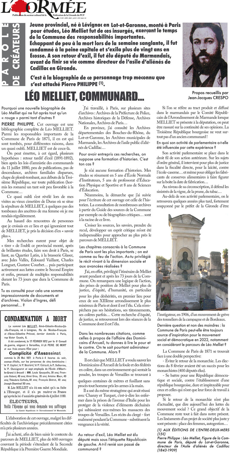 Figure de la Commune de Paris, Léo Melliet avait même réussi à échapper au massacre de mai 1871 car il était l’un de ces « insurgés » qui avait dû s’exiler vingt ans en Ecosse pour échapper à la mort. Révolutionnaire convaincu, on découvre toutes les facettes d’un fils de boulanger qui a vécu toute son enfance à Duras. De son engagement politique dans les régions de France à son poste de directeur de l’asile de Cadillac où il meurt en 1909 en passant par les nombreux combats qu’il mène.