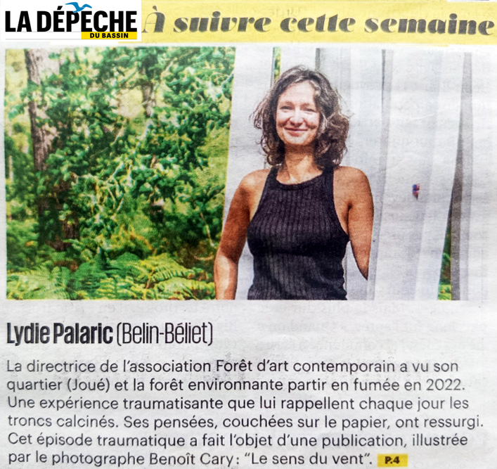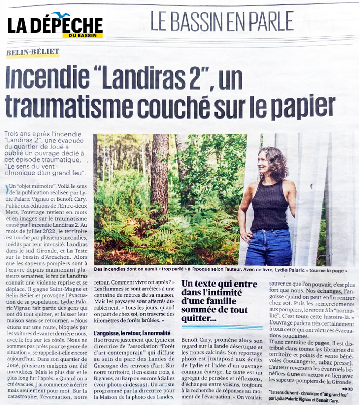 “Éloignez-vous dans le sens opposé au vent” est la première consigne des pompiers lors d’un départ de feu. Avec ce titre suggestif, Le Sens du vent, Lydie Palaric donne d’emblée le ton de cette chronique du grand feu de Landiras qui a ravagé les landes du Sud Gironde à l’été 2022. Un récit pudique et bouleversant auquel répondent les photographies de Benoît Cary, paysages d’arbres et de terres carbonisés, telle une esthétique de fin du monde, à la fois belle et glaçante.
